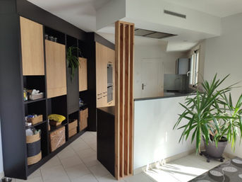Nous avions des souhaits particuliers pour notre cuisine aménagée ( espace de rangement et plan de travail plus important notamment.) La réalisation a parfaitement répondu à nos attentes. L'esthétique s'intègre totalement à notre pièce de vie.Un très grand merci à sa créatrice, toujours à l'écoute, qui a su nous guider dans nos choix. Si vous avez un projet, vous savez maintenant à qui vous adresser.